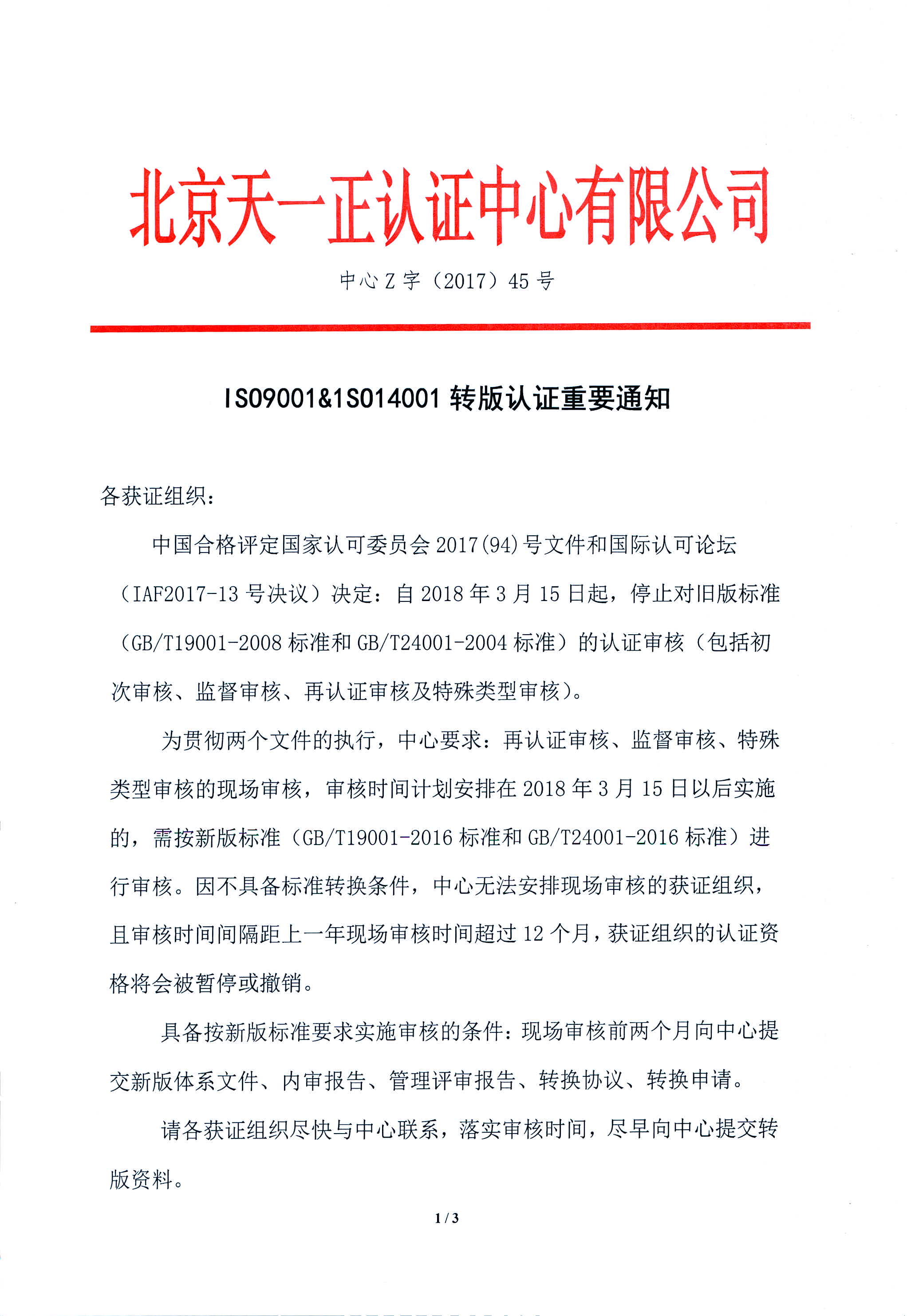ISO9001和ISO14001转版认证重要通知