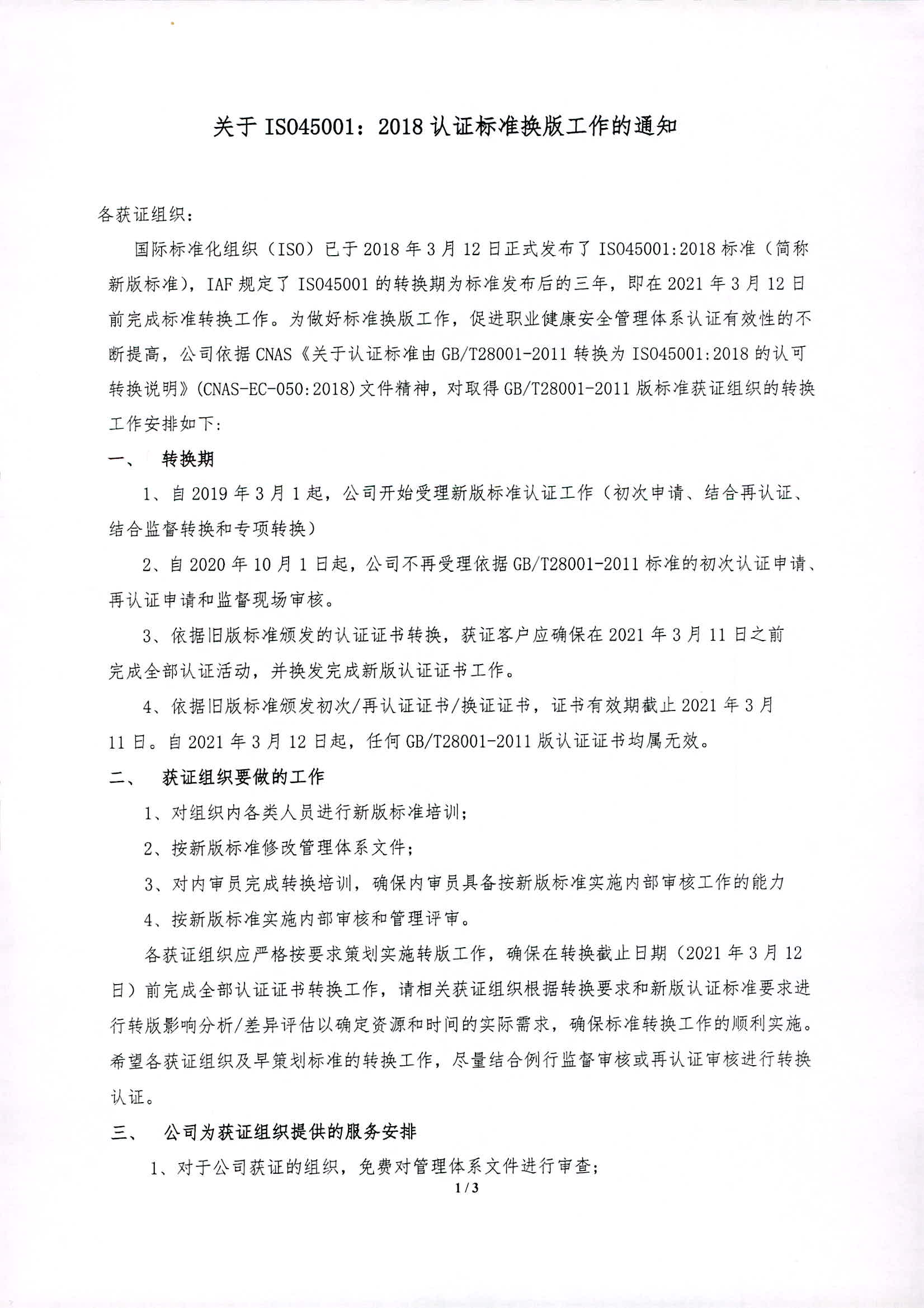 ISO45001:2018认证标准换版工作的通知