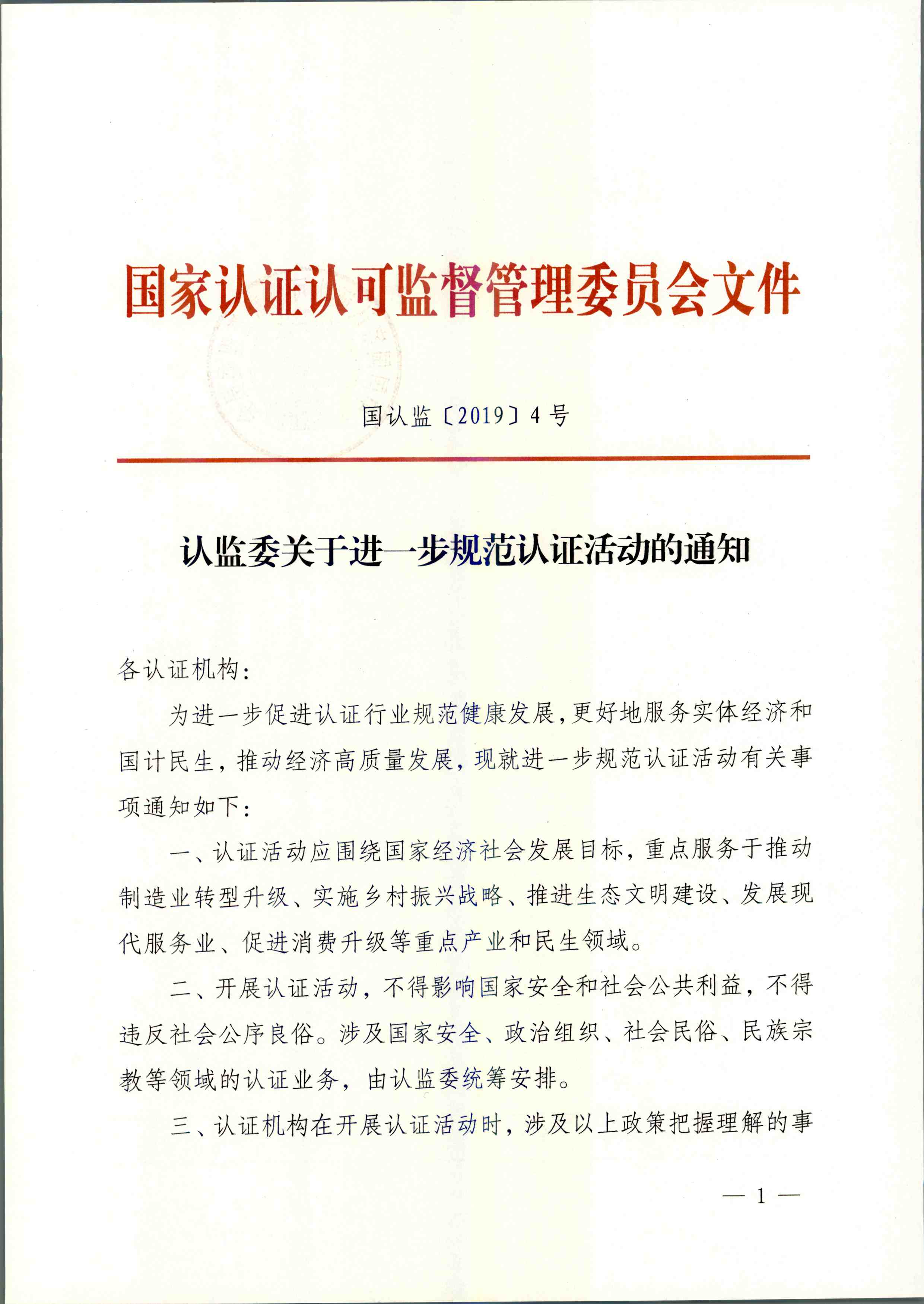 认监委关于进一步规范认证活动的通知-国认监2019-4号