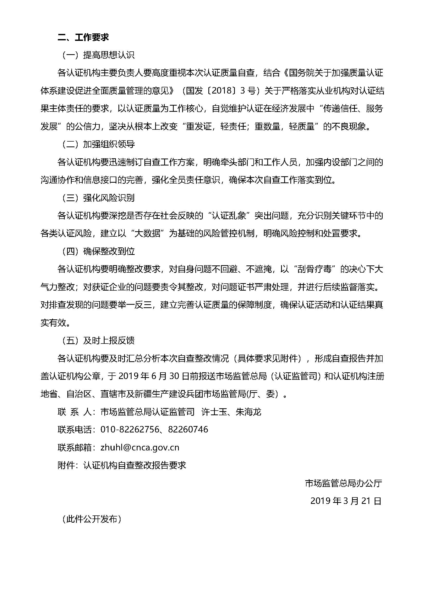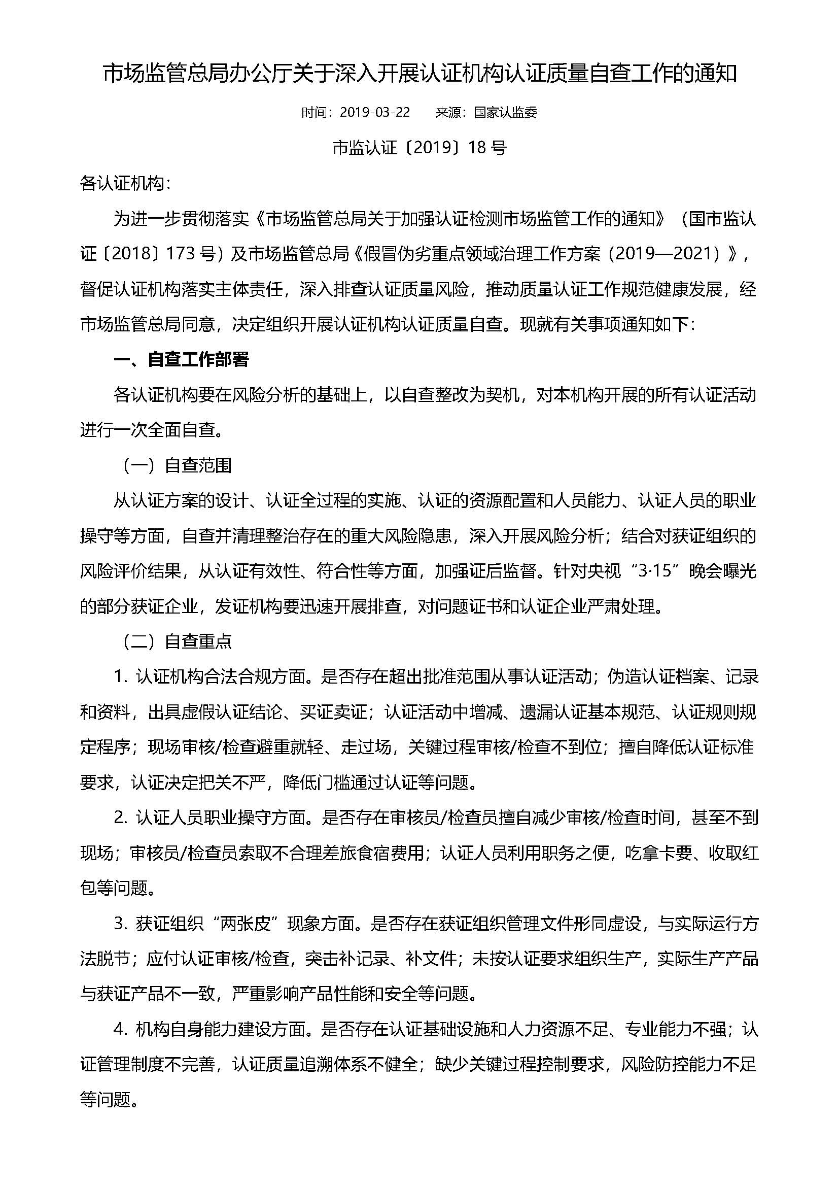 市场监管总局办公厅关于深入开展认证机构认证质量自查工作的通知-市监认证2019-18号