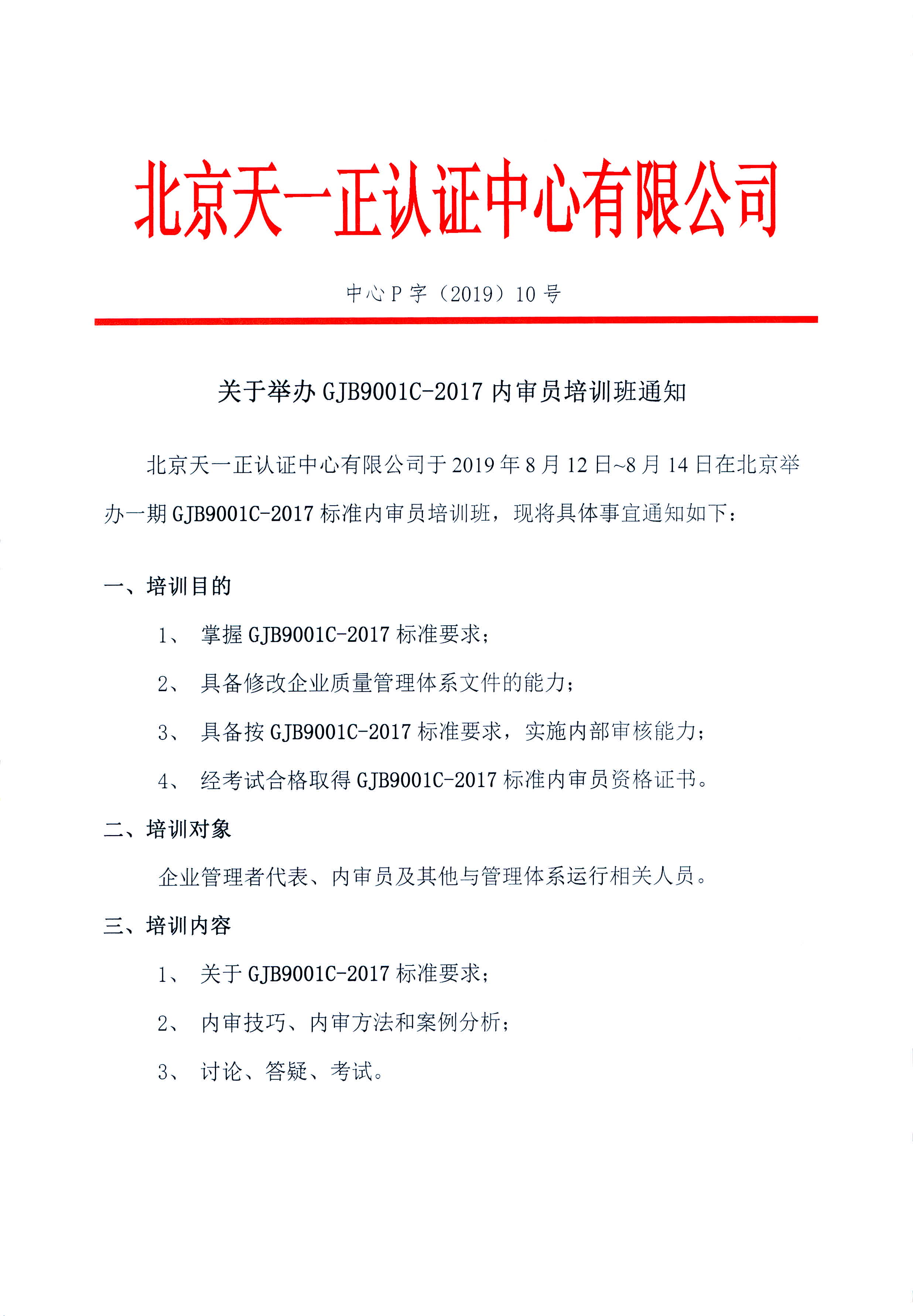 关于举办GJB9001C-2017内审员培训班通知