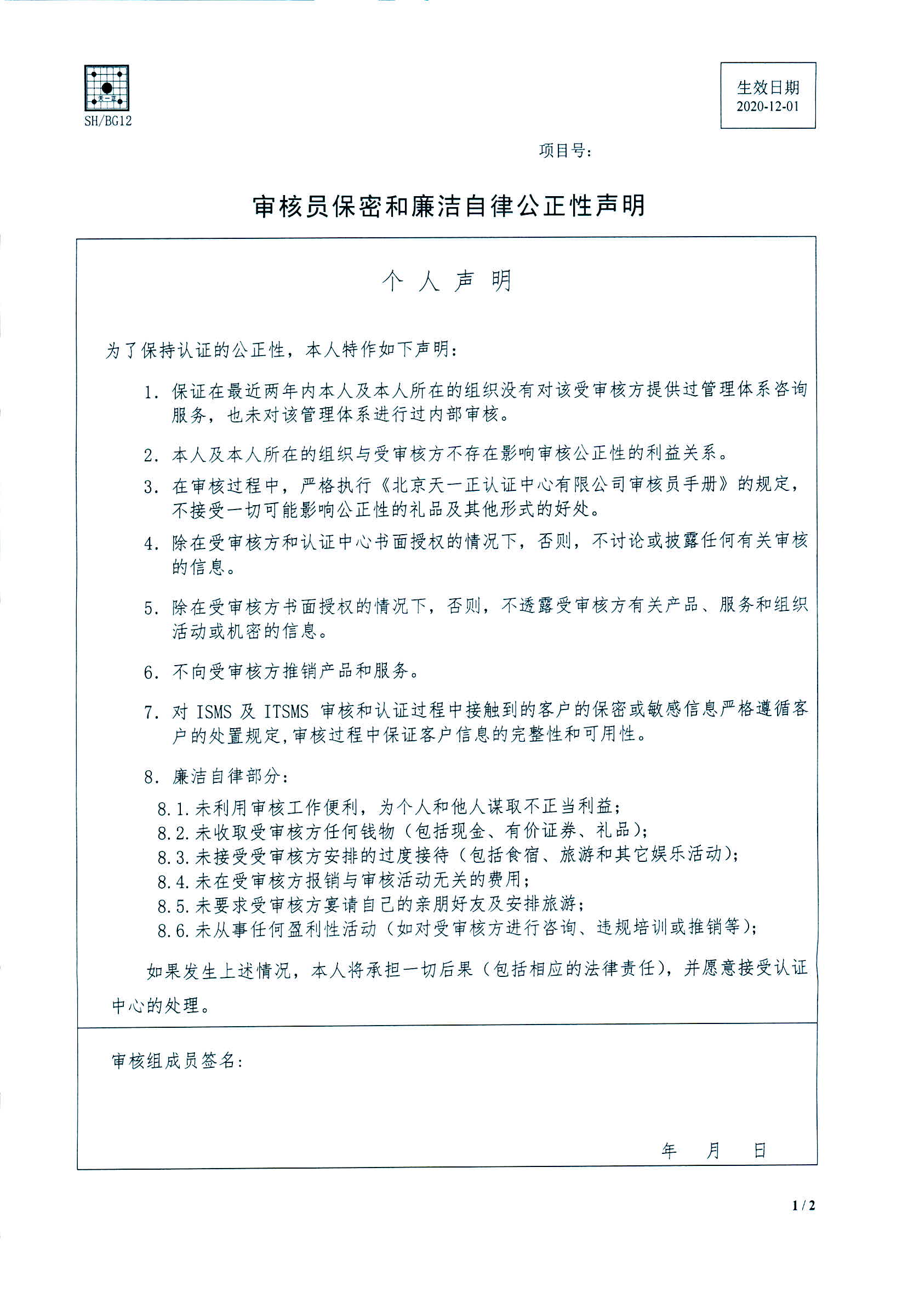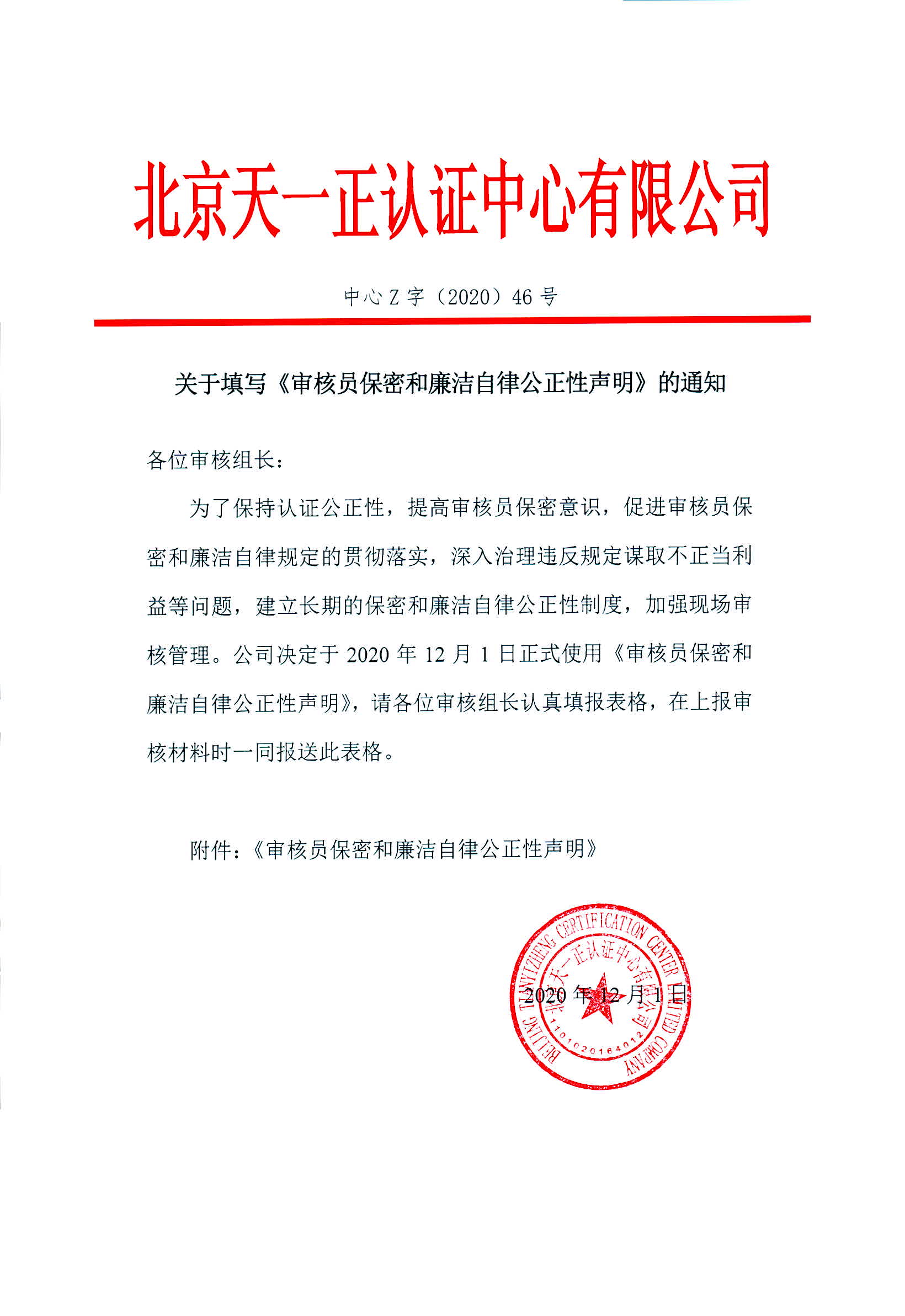中心Z字(2020)46号关于填写《审核员保密和廉洁自律公正性声明》的通知