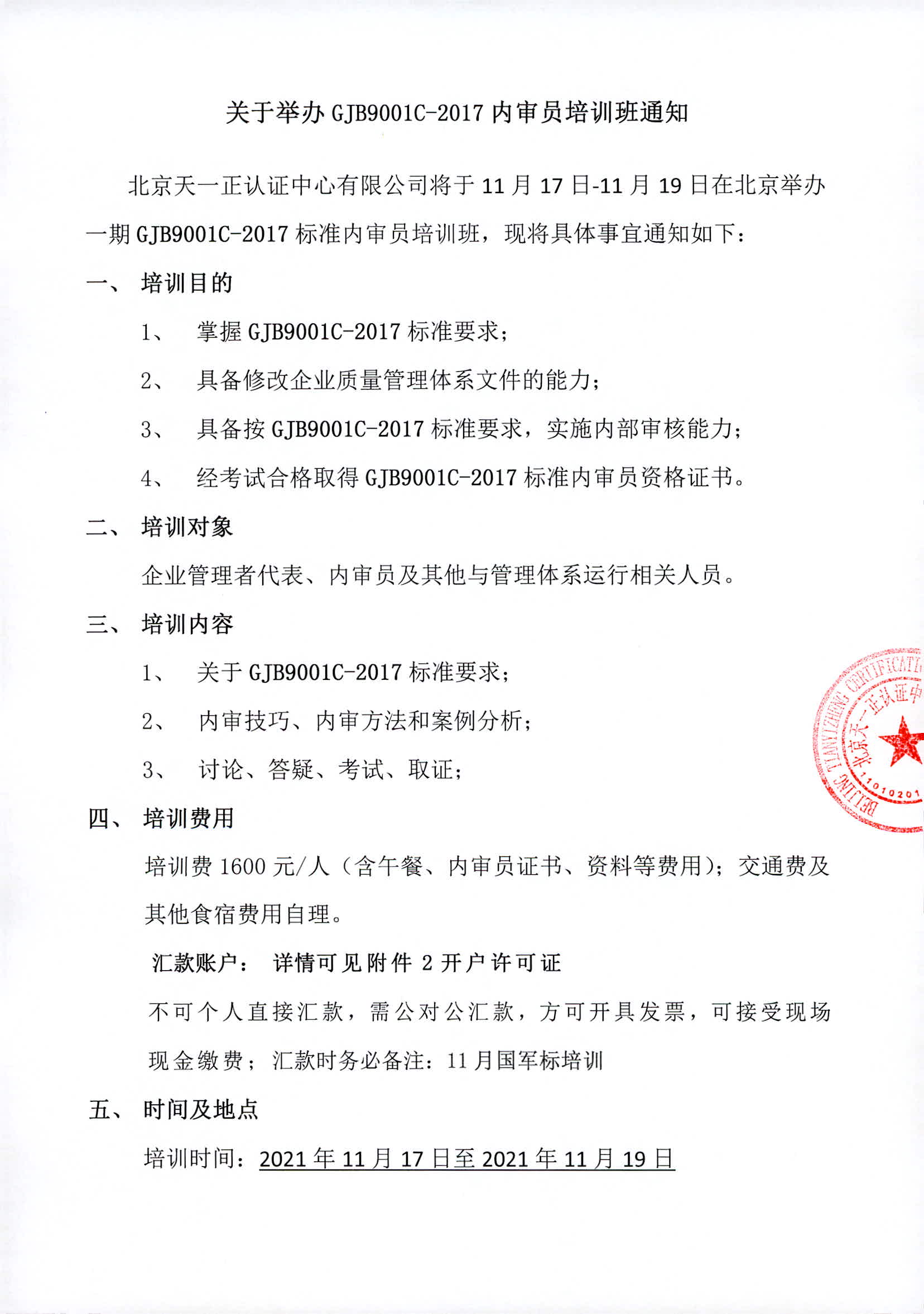 关于举办GJB9001C-2017内审员培训班通知