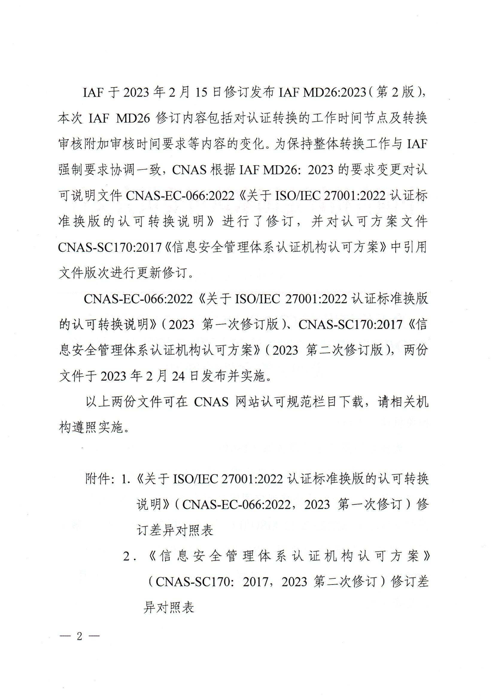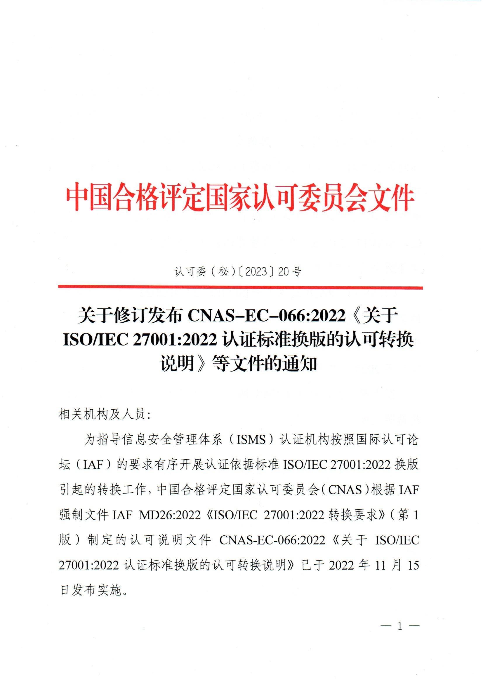 关于修订发布CNAS-EC-066-2022 《关于ISOIEC 27001-2022认证标准换版的认可转换说明》等的通知