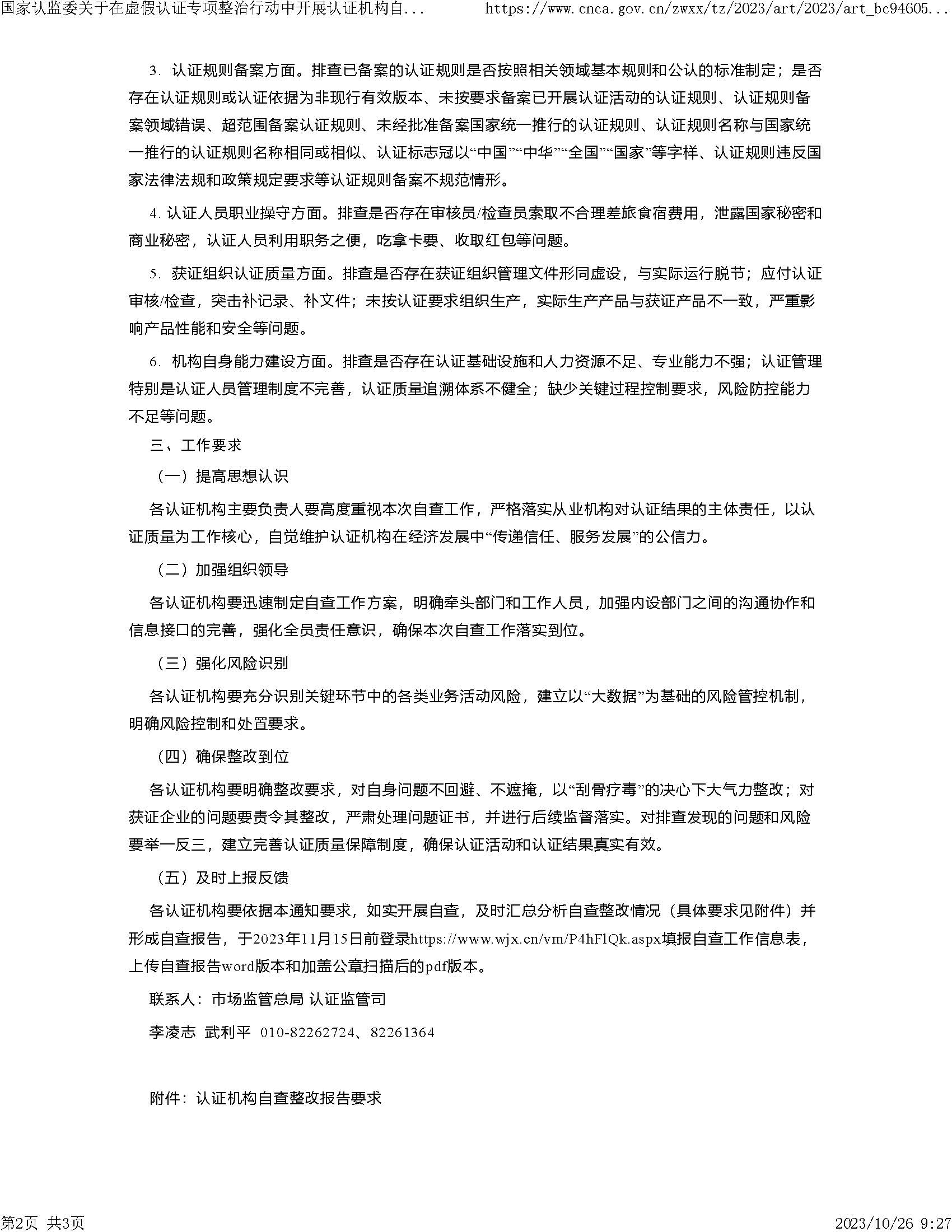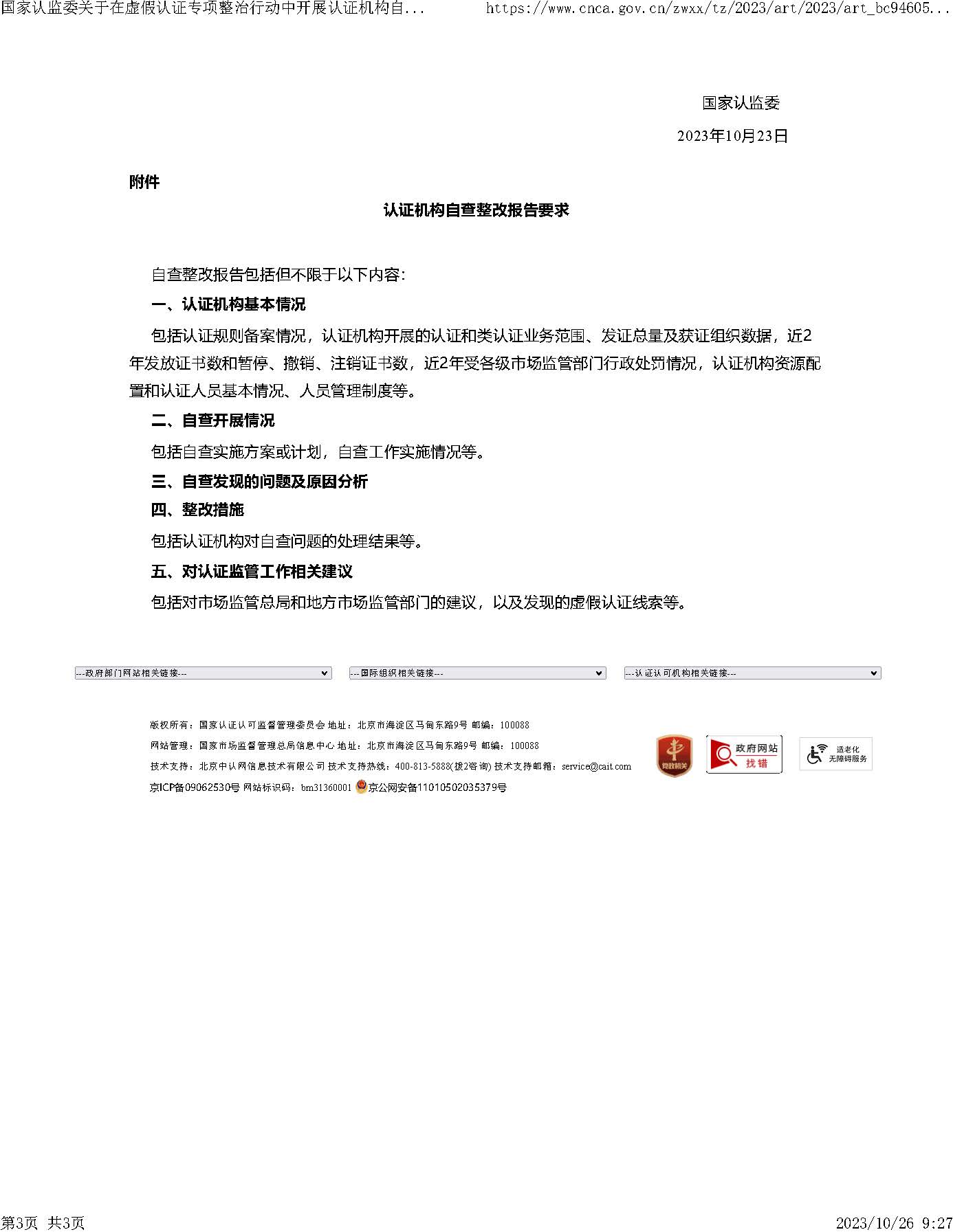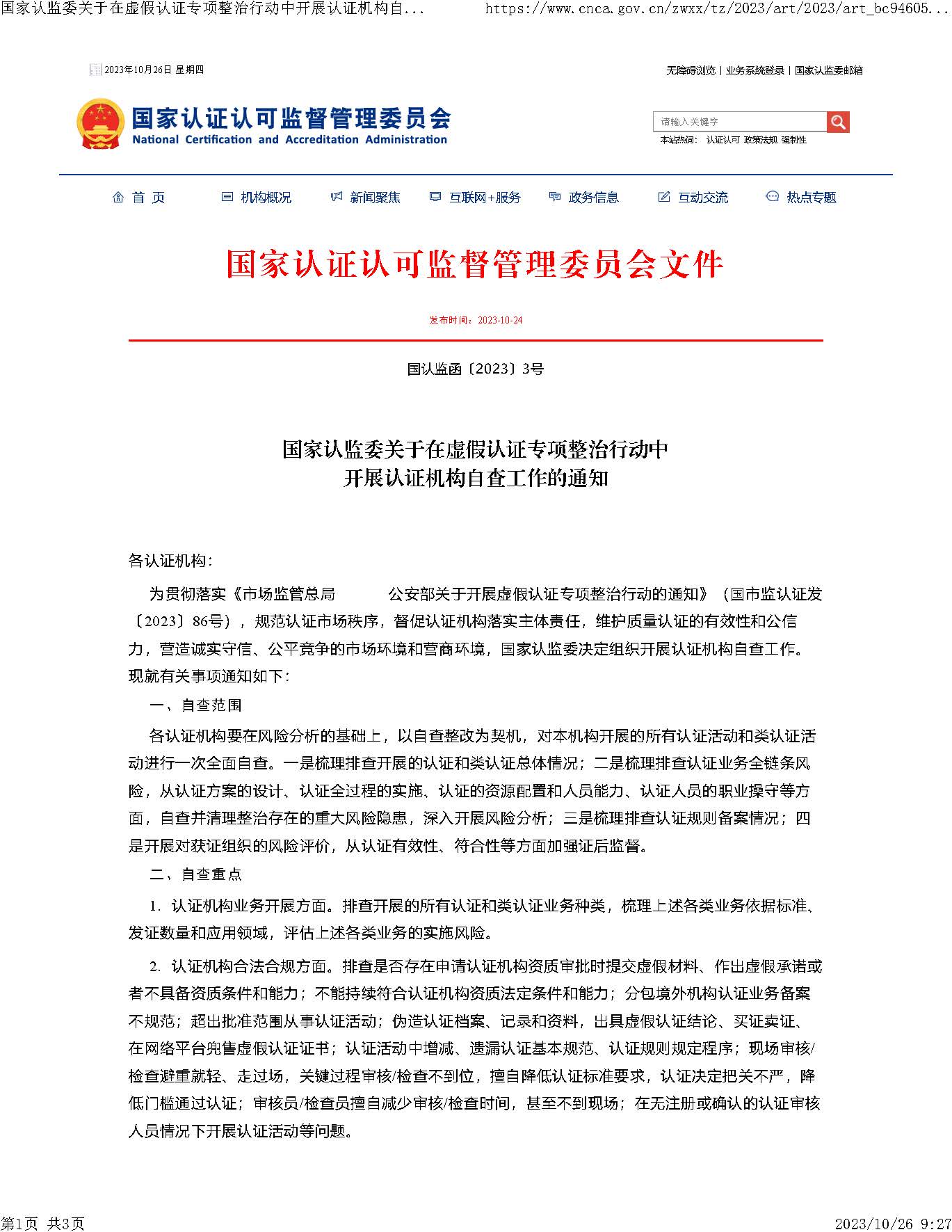 国家认监委关于在虚假认证专项整治行动中开展认证机构自查工作的通知